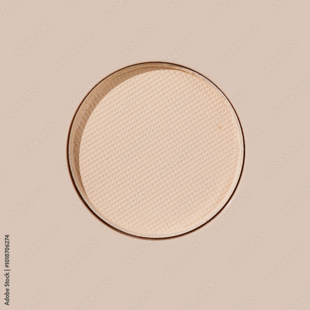Close-up of matte light beige eyeshadow refill, neutral shade on beige background with sun shadows, detailed texture, Round Swatch makeup powder for cosmetics, beauty product, makeup