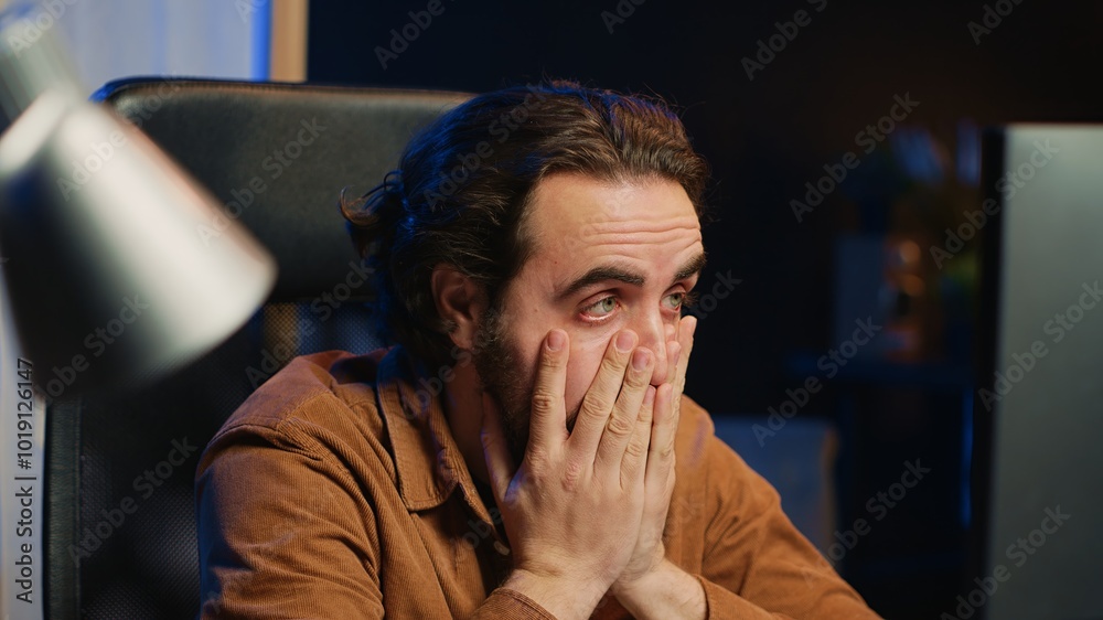 Angry computer scientist fuming after failing to remove all bugs while coding on workstation desktop. Teleworking IT professional smashing desk, irritated by script errors