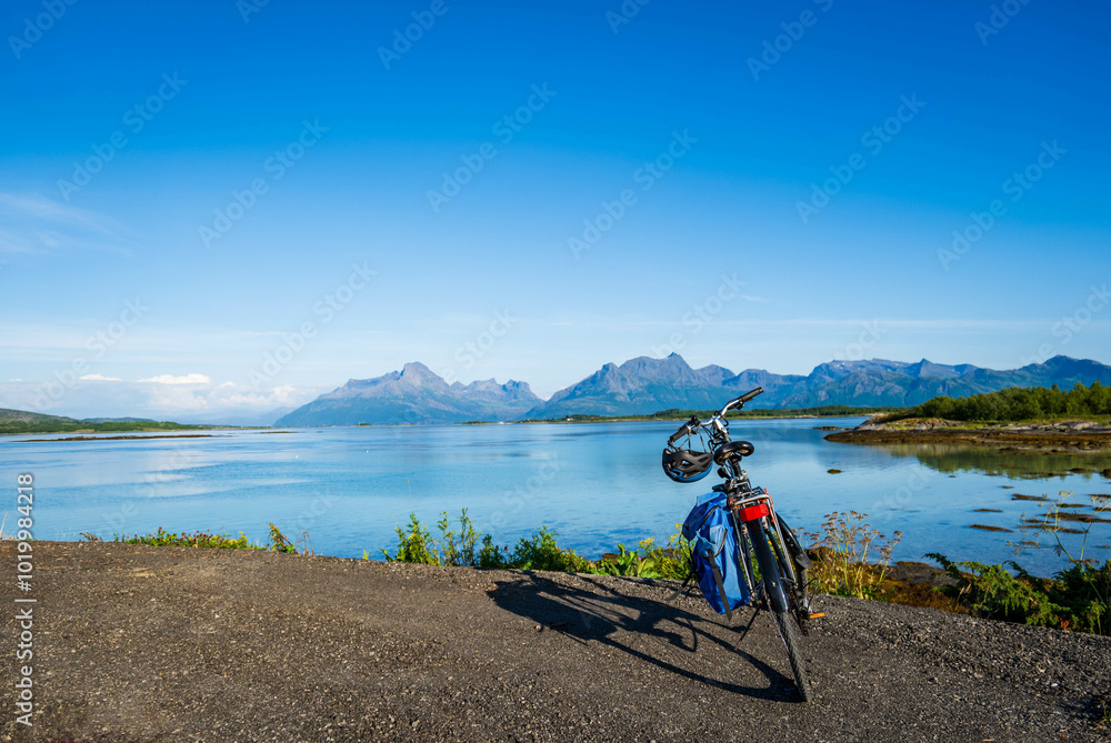 Bikepacking concept photo with touring bicycle with beautiful landscape in summer with sea and mountains in Northern Norway, Scandinavia