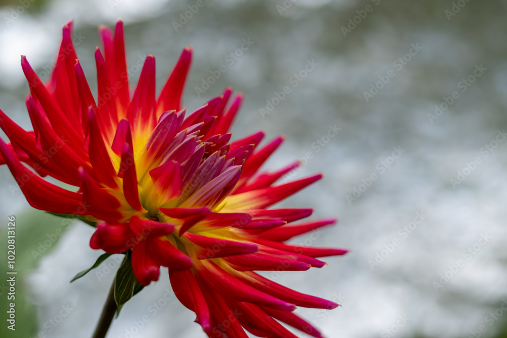 gros plan d'une fleur de dalhia rouge au coeur jaune isolée, sur un bokeh lumineux, en extérieur,