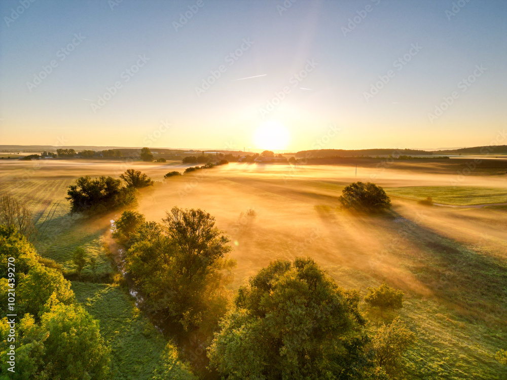 Sonnenaufgang über Schweinfurt mit Nebelschleiern, Nebel über den Feldern, mit einem Bach und Bäumen und die aufgehende Sonne am Horizont, Drohnenfoto, Luftaufnahme, Schweinfurt, Bayern, Deutschland