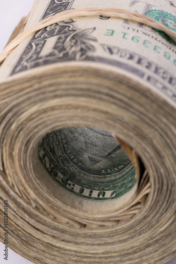 Rolled up 1 US dollar bills with an image of a pyramid and an all-seeing eye inside the roll
