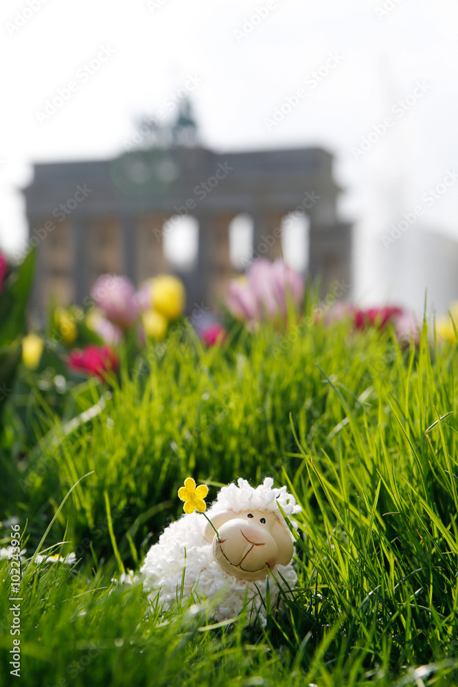 easter in Berlin, toy sheep hiding in green grass with Brandenburger Tor and a fountain