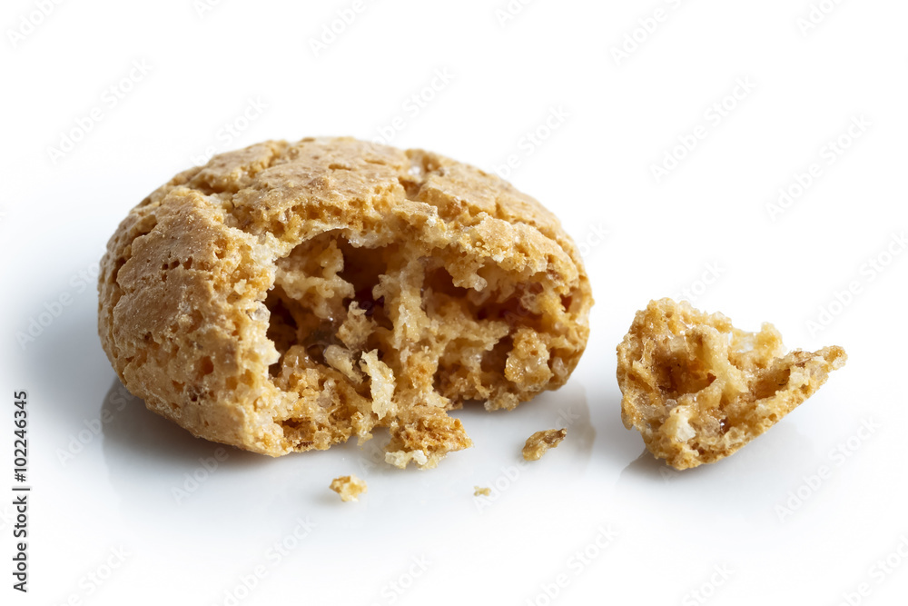 Detail of one broken Italian amaretti biscuit isolated on white