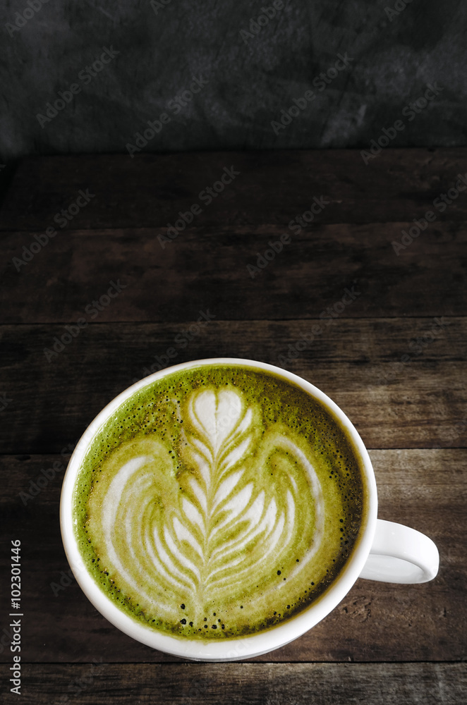 A cup of green tea matcha latte.