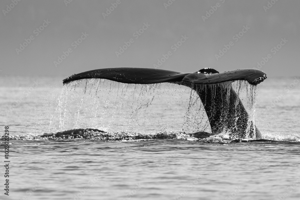 black and white picture of a humpback whale fin off the coast of Vancouver Island