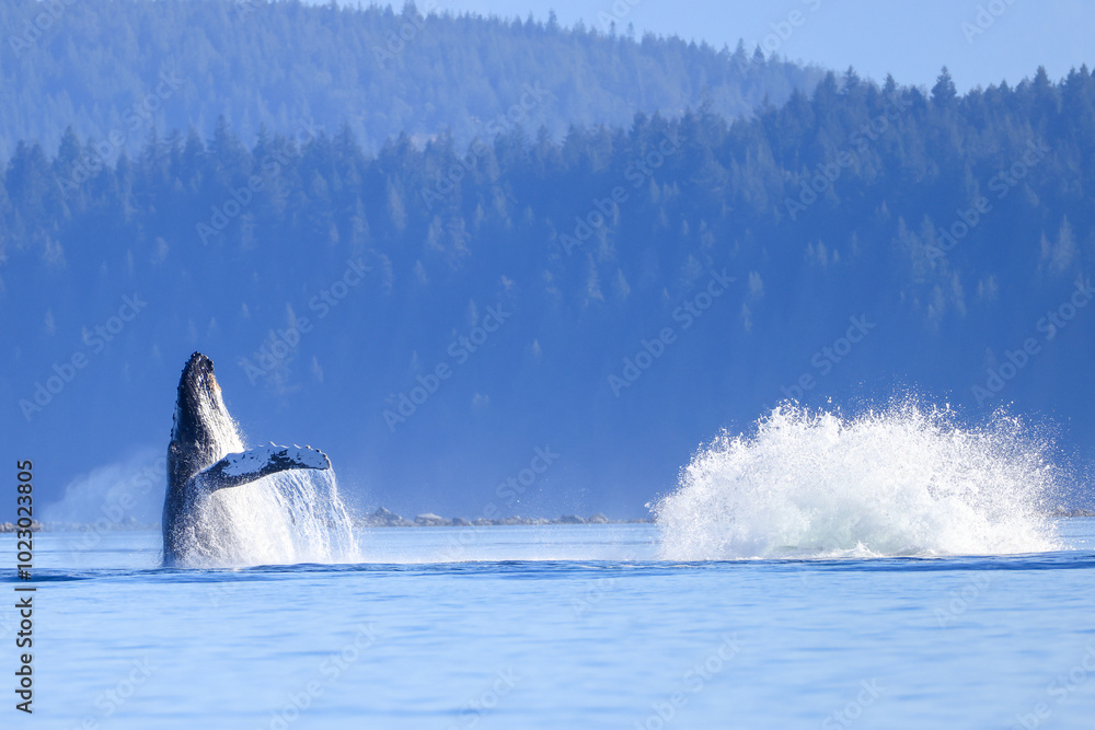 a humpback whale jumps out of the water off the coast of Vancouver Island