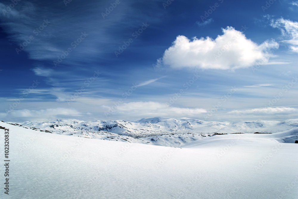 Winter view on mountain range. Pure white snow field. Blue sky, white cloud. Norway.