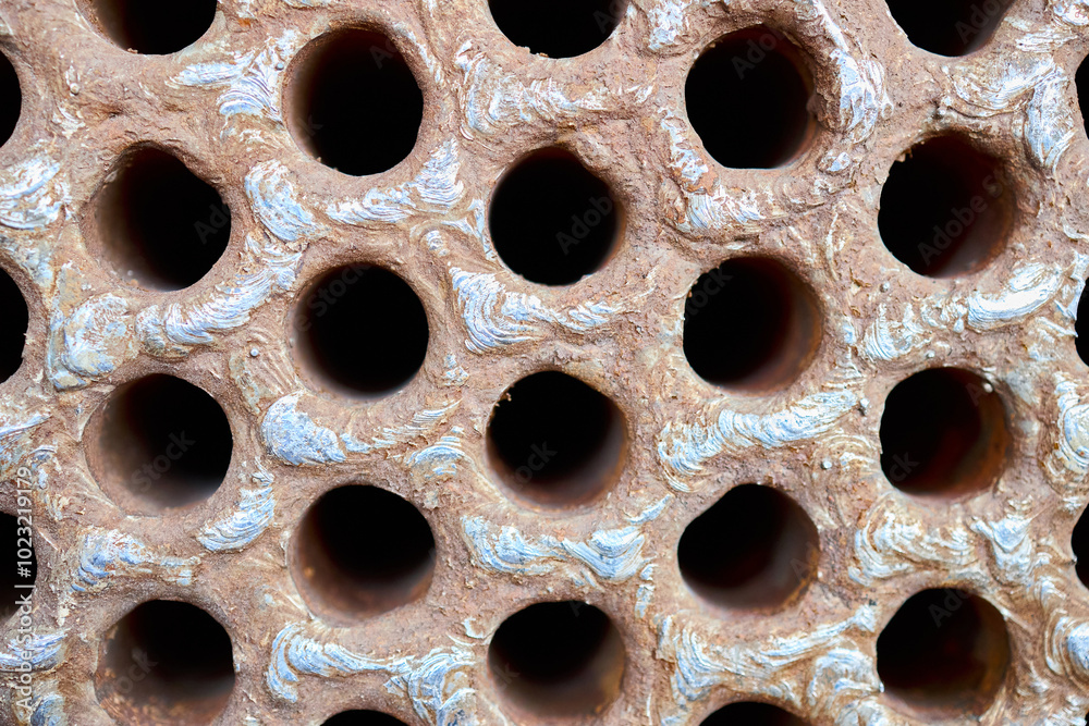 Tube sheet plate of heat exchanger or boiler closeup texture macro industrial background with insoluble hard mineral deposits salts scale welding seams and corrosion. Trypophobia concept.
