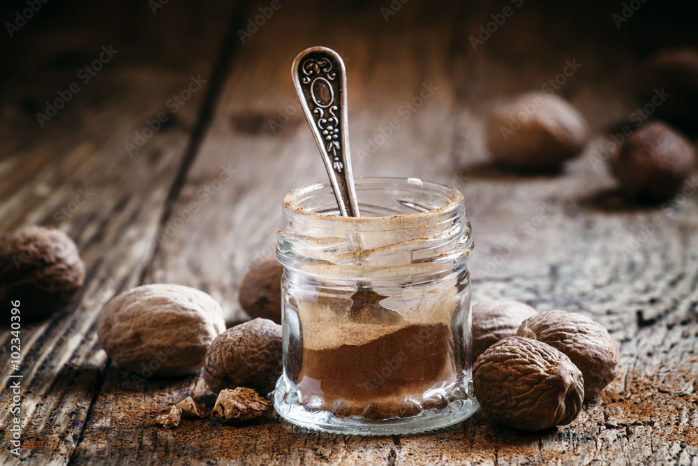 Ground nutmeg in a jar and whole nuts on an old wooden backgroun