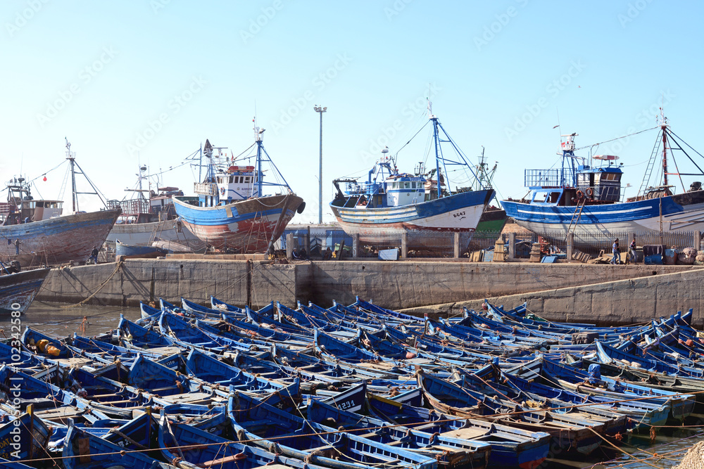 Essaouira, Morocco - January 6, 2016: blue boats in the harbour of essaouira