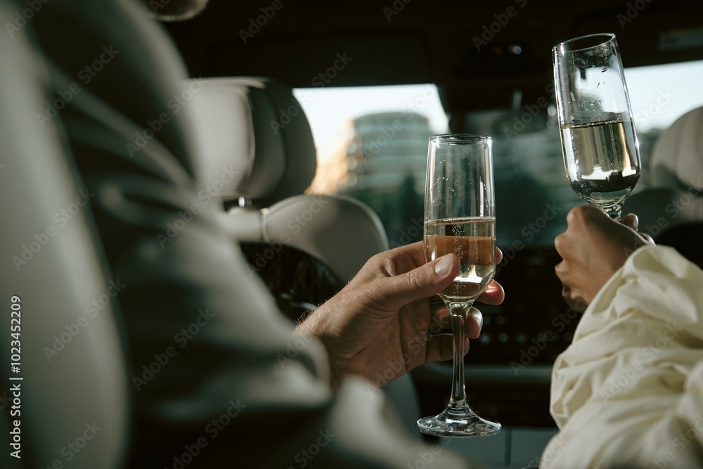 Close up on hands of unrecognizable couple holding champagne flutes clinking glasses while celebrating anniversary in back seat of car, copy space
