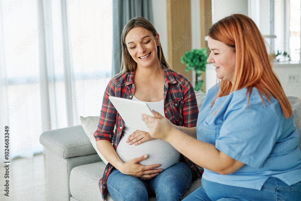 woman pregnant mother pregnancy belly patient nurse visit control exam test maternity computer visit technology hospital talking tablet support explaining