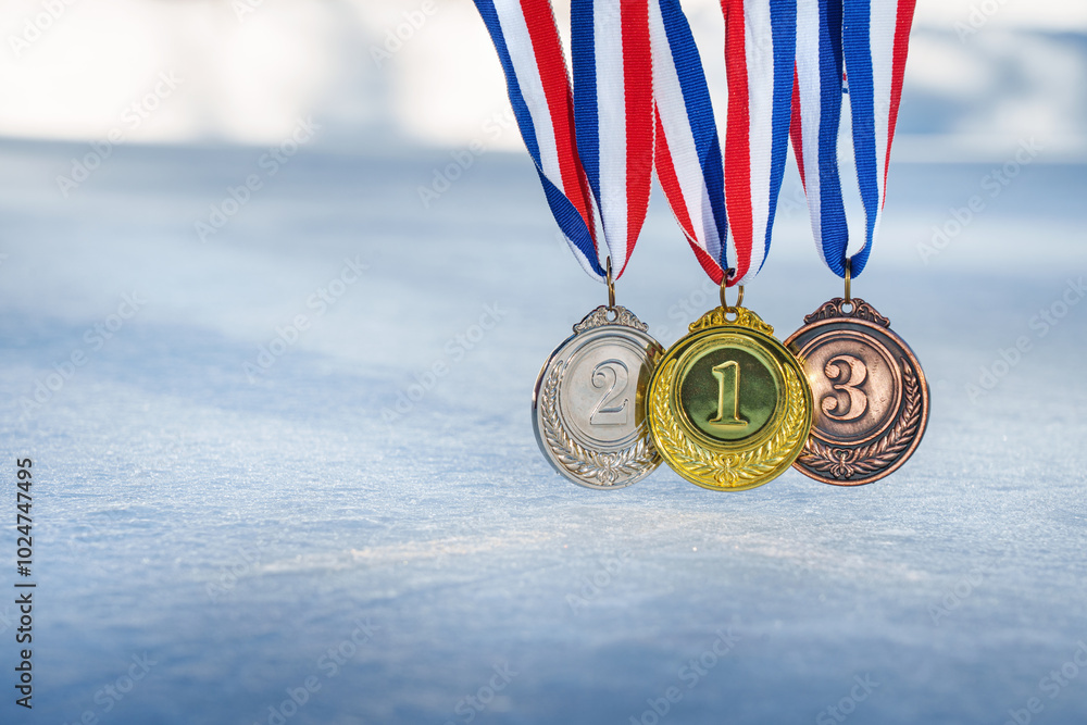 golden medal on the textured ice surface in the snow - winter sport successful concept