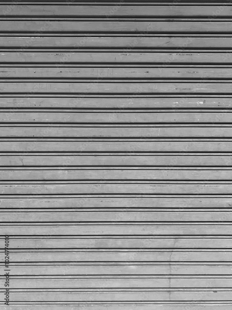 Old white metal roller shutters door. Line pattern texture aluminum doors background. Old gray metal background texture.