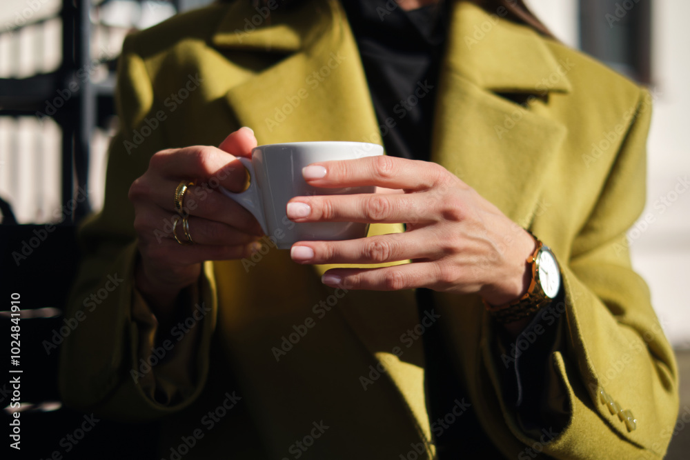 close-up hands holding a cup of coffee against the background of a street cafe with space for an inscription