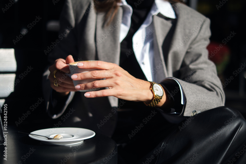 close-up hands holding a cup of coffee against the background of a street cafe with space for an inscription
