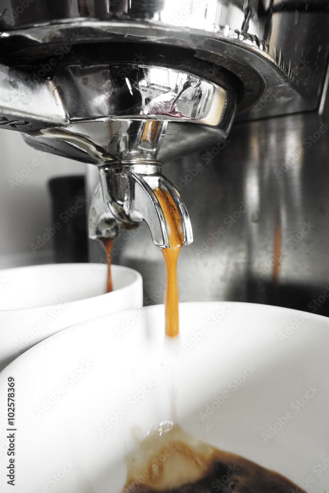 coffee machine preparing cup of coffee take with selective color technique and art lighting