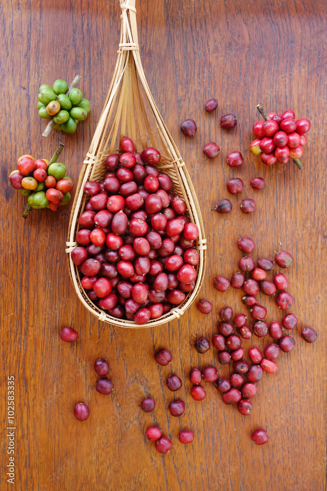 Close up of fresh coffee beans on wooden backgourng