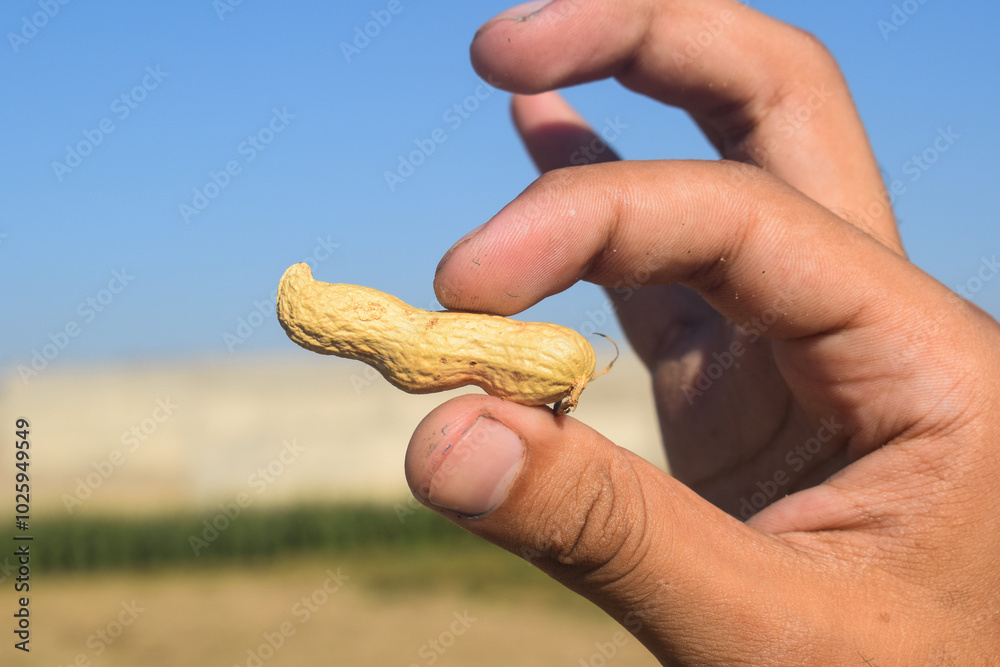 Person holding Peanuts with shell. Fresh groundnuts in hands, Hand holding peanuts with blurred background of pile of peanuts, blue sky and nature, Peanuts on hand