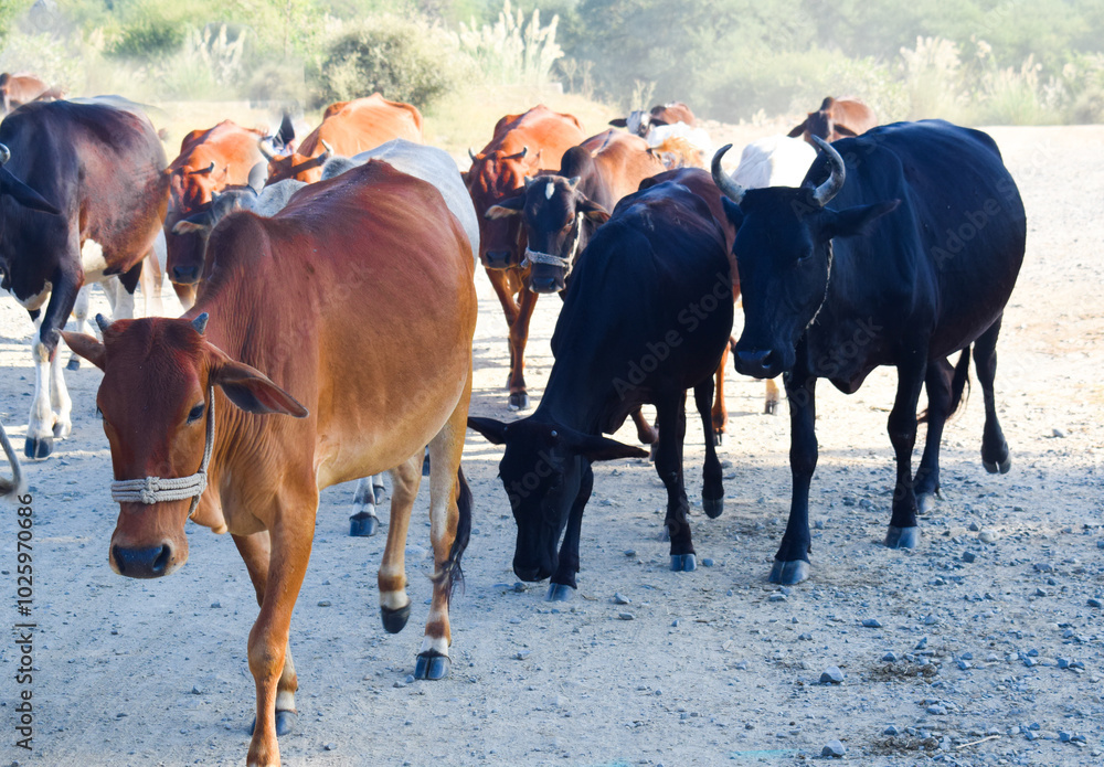 Sahiwal cattle Breed, Big cow in natural habitat, Indian cows and bulls are resting on the grass group on road a nice looking