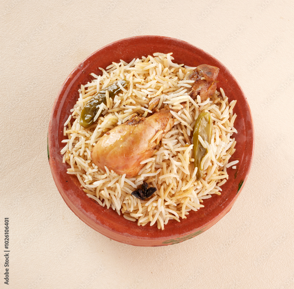 Matka Pulao or Matka Biryani, Delicious food make with marinated chicken, spices and basmati rice.