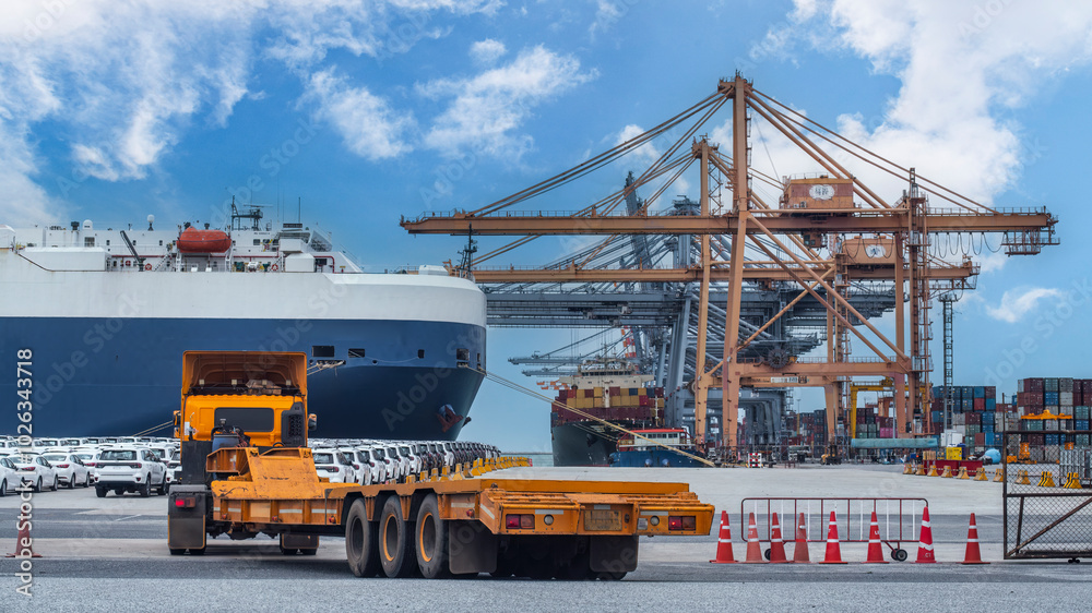 Logistics container dock cargo yard with working crane bridge in shipyard with transport logistic import export background.