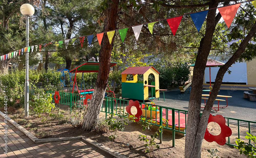 Colorful children's playground in a kindergarten setting with play structures and tables surrounded by trees