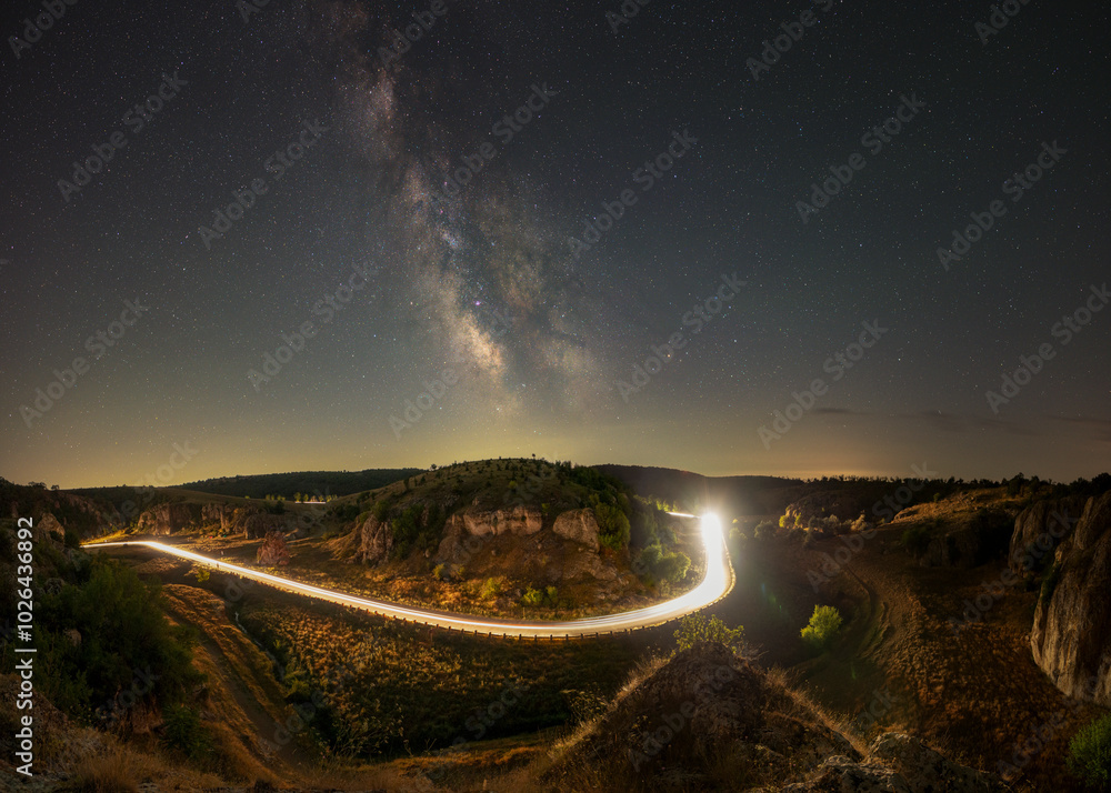 Cheile Dobrogei road with car light trails and Milky Way