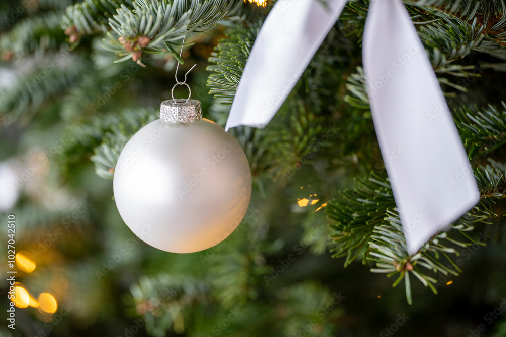 Beautifully decorated, illuminated Christmas tree in the living room with Christmas tree baubles.