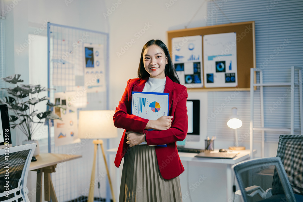 Young professional woman is holding documents and smiling in a modern office setting, conveying confidence and competence