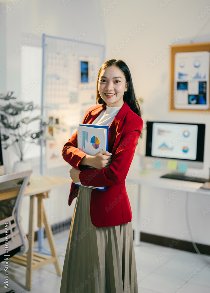 Confident young manager in office, holding charts, exuding professionalism and success. Happy asian businesswoman showcases expertise in finance and marketing, hinting at startup involvement