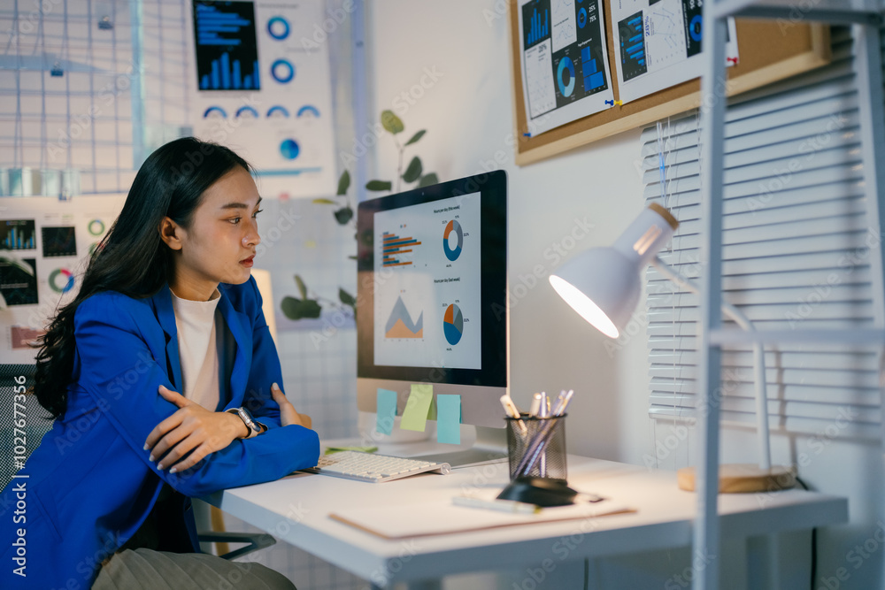 Young businesswoman is working late, analyzing charts and graphs on her computer screen. She is concentrating on her work and trying to meet a deadline