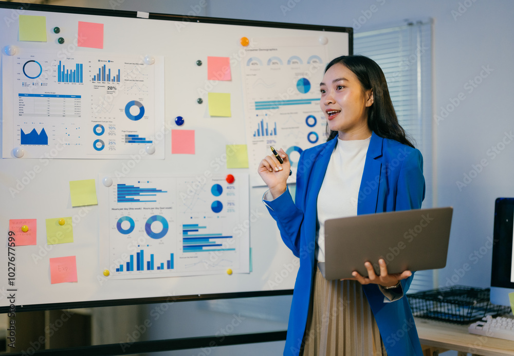 Businesswoman is standing in front of a whiteboard with graphs and charts on it, holding a laptop and giving a presentation