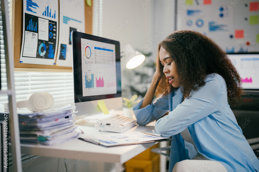 Young businesswoman is suffering from a headache while analyzing marketing data on a computer screen at her office desk