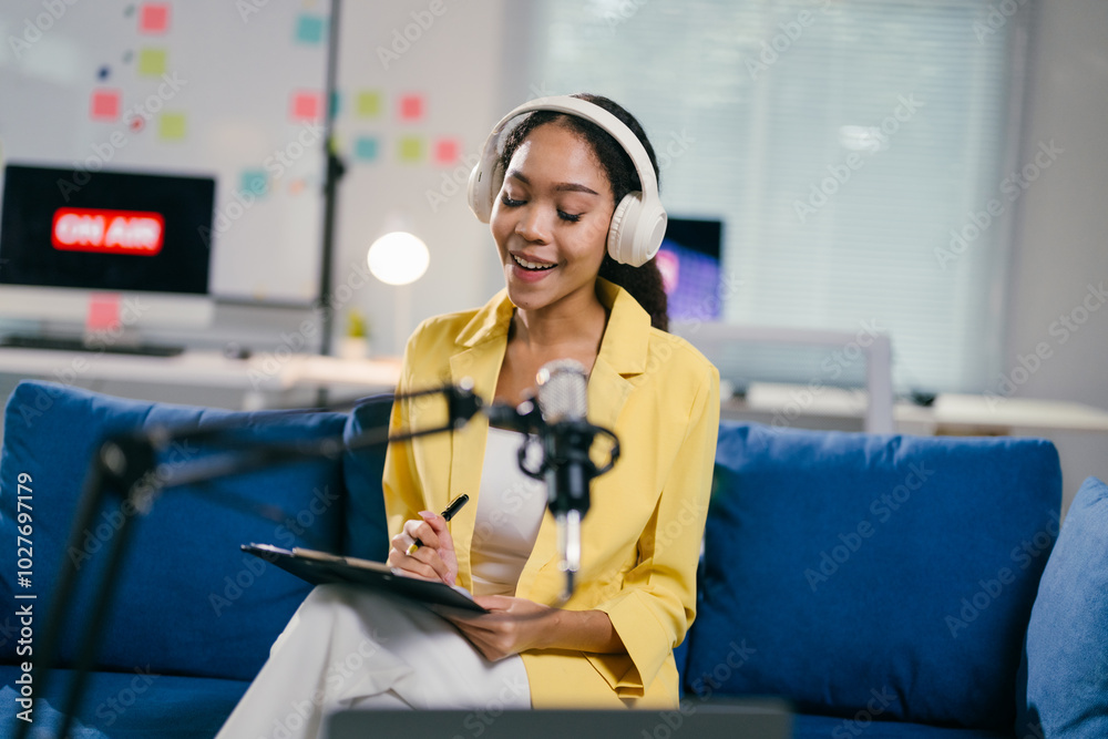 Woman happily records a podcast in her home studio, showcasing her skills as a digital influencer through online radio content creation