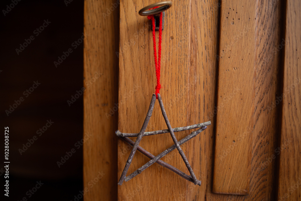 Five pointed star made from twigs, tied at points, red string attached, rustic decoration, festive ornament, natural design, hanging decoration, holiday decor, DIY
