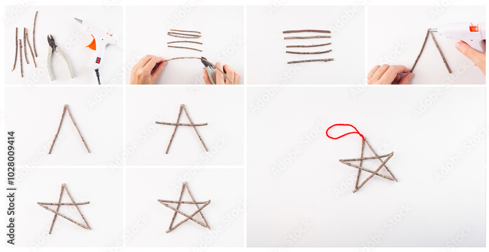 Step-by-step tutorial for making a star ornament with wooden sticks and hot glue. Craft photography collage with instructions for DIY holiday decoration. Christmas craft project