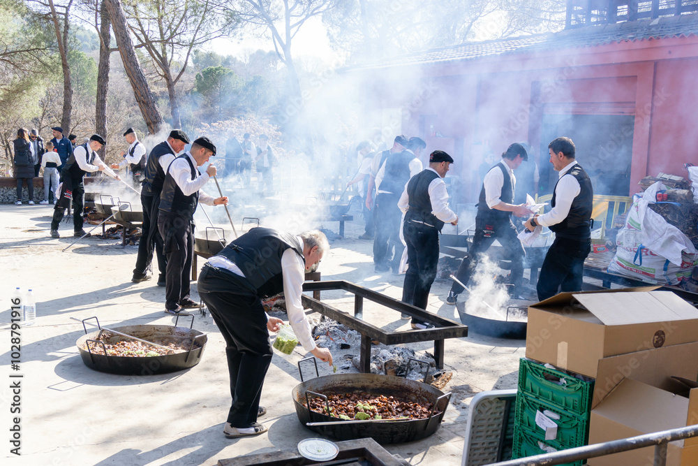 Sant Fruitos de Bages, Spain - February 19, 2023: Cooks making rice paellas in a village competition
