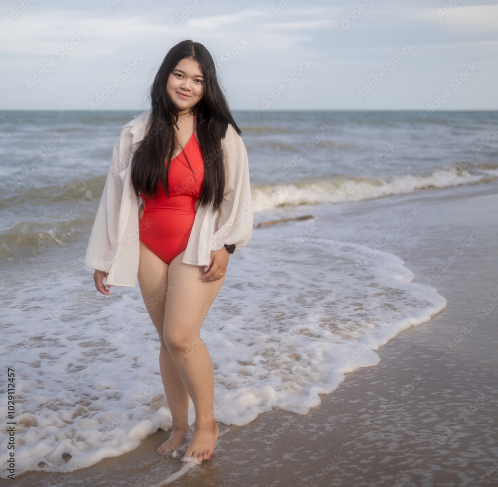 Woman young asian fat chubby cute beautiful smile happy fun enjoy relax freedom bikini swimwear body sexy plus size look sea beach sunset clean blue sky calm nature ocean wave water travel on holiday