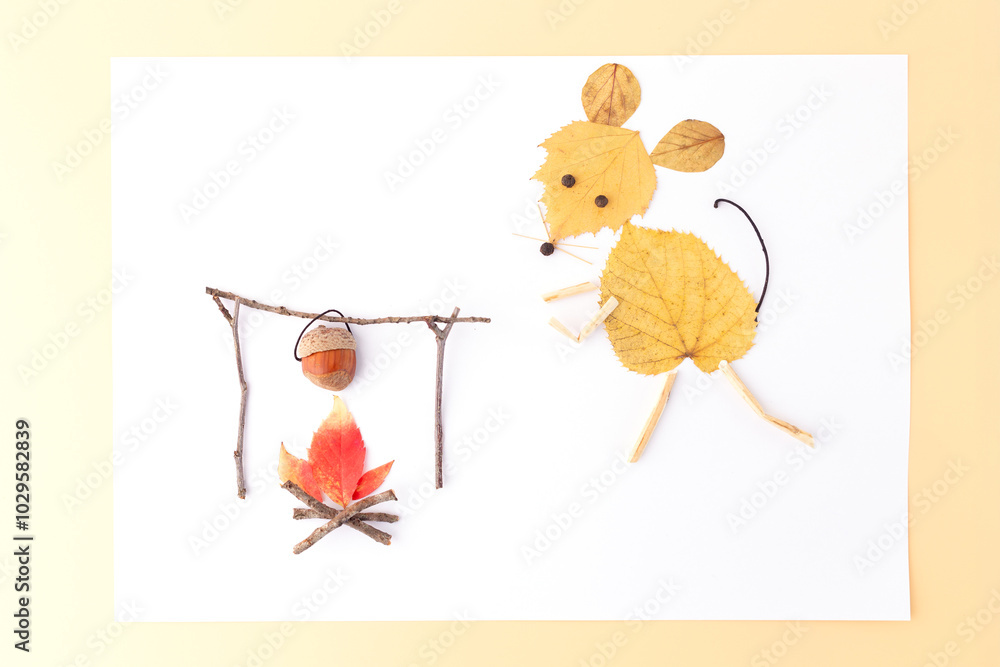Mouse made of yellow autumn leaves standing near a campfire with a pot hanging from twigs, acorn and red leaf used to depict fire on a white background. Minimalistic flat lay composition