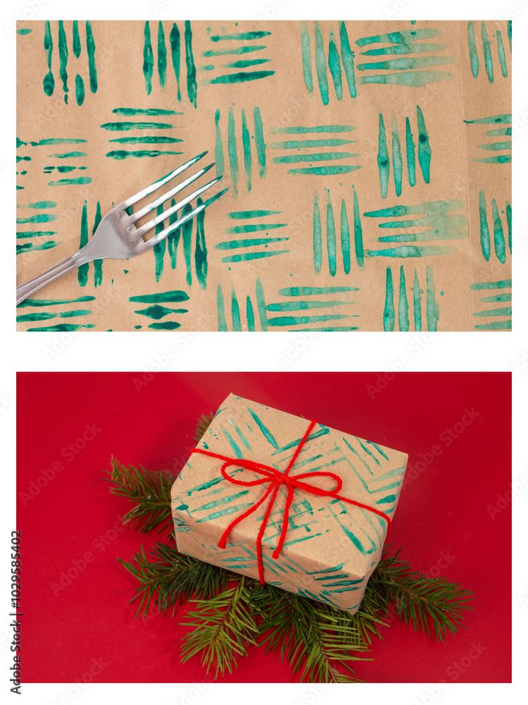 Fork and paint decorative stamp tutorial, DIY personalized wrapping paper. Creative Christmas activity for kids, crafting unique designs on paper with simple materials for festive fun