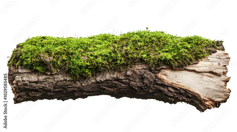 Close-up of a rustic wooden log covered in vibrant green moss, isolated on a white background. Perfect for nature or organic themes.