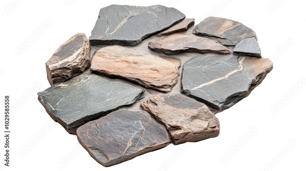 Close-up of layered stone slabs with varied textures and earthy tones, ideal for natural design projects or landscape architecture inspiration.