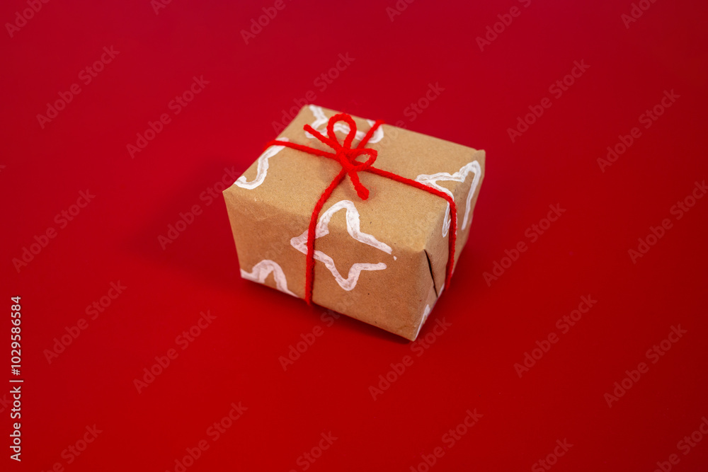 a gift wrapped in brown paper adorned with white star pattern created using a folded toilet paper roll. The gift is tied with a bright red ribbon, decorating a gift using common household items