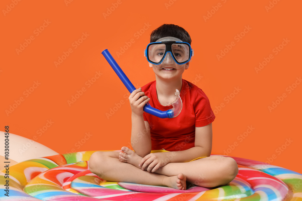 Cute little boy in swimming mask sitting on inflatable mattress on red background
