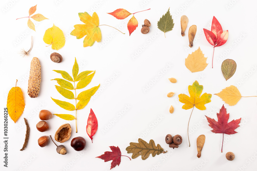 an assortment of autumn leaves, seeds, nuts, and other natural objects arranged on a white background.