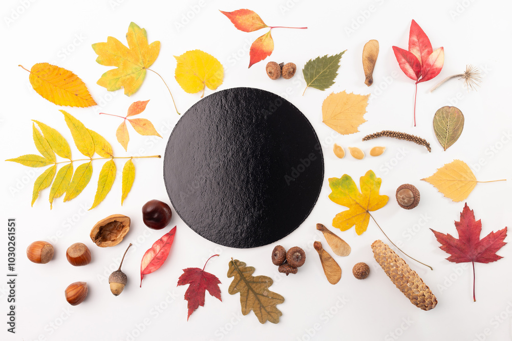 collection of various autumn leaves, nuts, seeds, natural objects arranged around a black circular object in the center. The leaves are in shades of yellow, red, and green, perfectly fall season