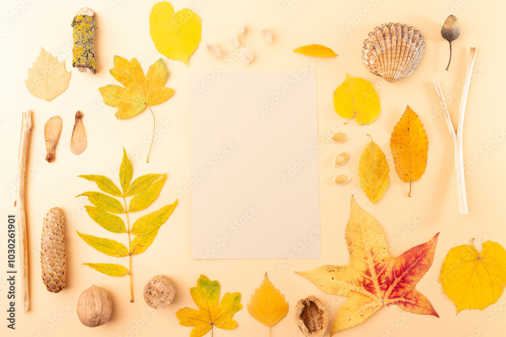 a beautiful autumn themed arrangement on a yellow background. an array of fall elements and leaves. find pine cones, acorns, chestnuts, and other seed pods, an aesthetically pleasing composition,