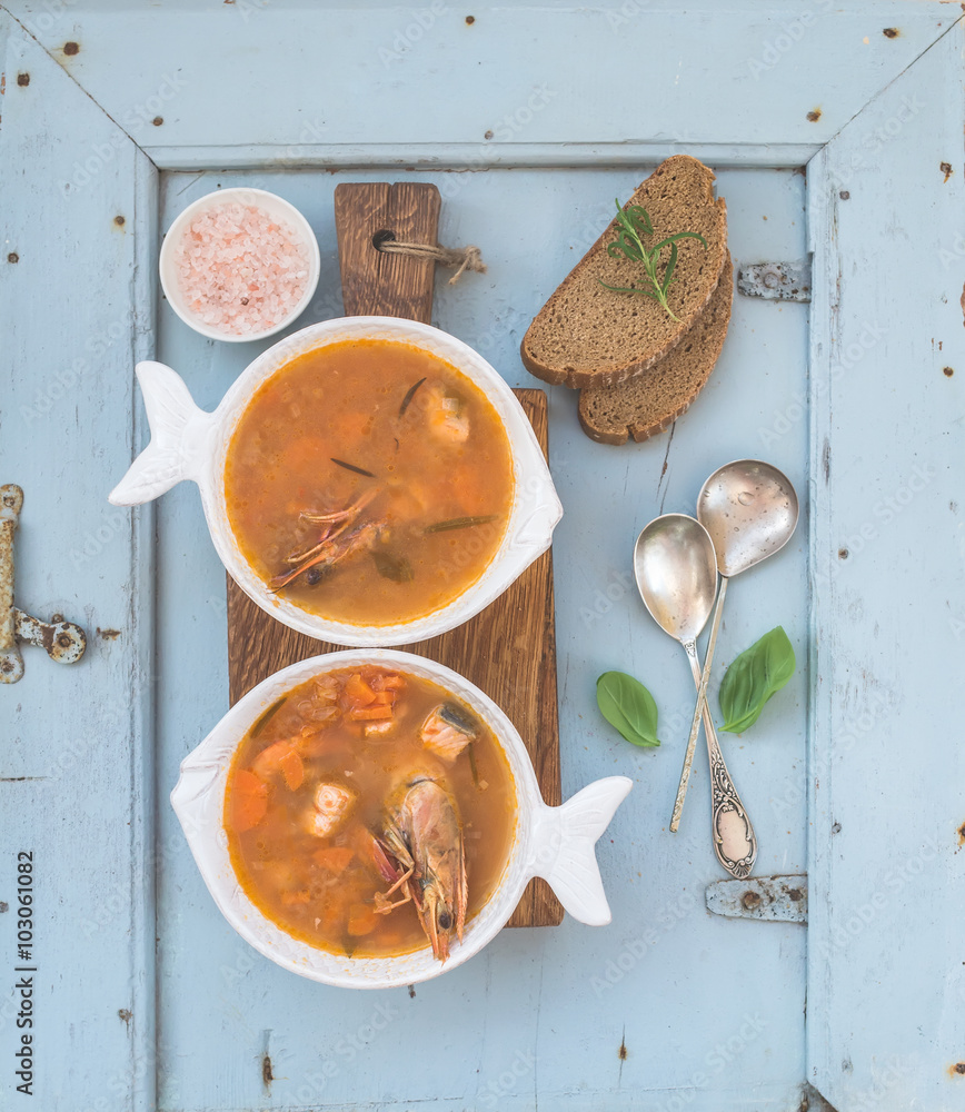 French Bouillabaisse fish tomato soup with salmon fillet, shrimp and spices on rustic wooden board over light blue background